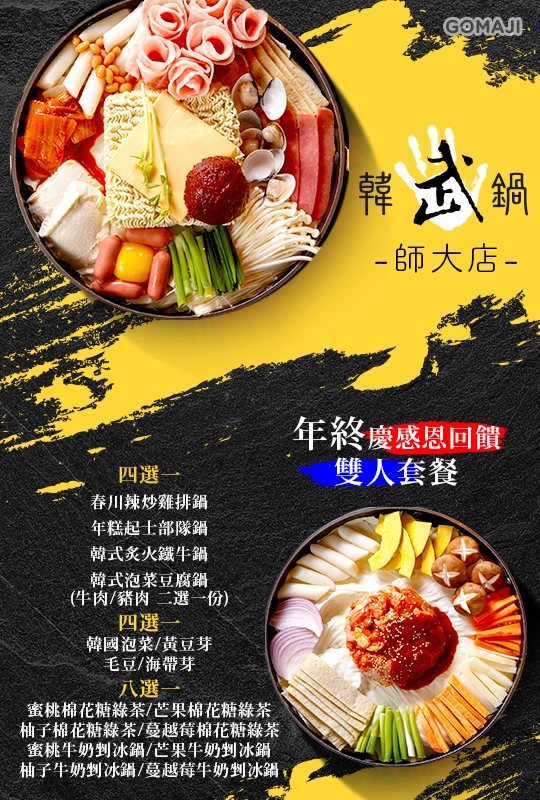 【韓武鍋(師大店)】精心製作五品功夫鍋,每一鍋都秉持著功夫理念,嚴選精緻食材、鑽研美味秘方,對「韓」味也做足了功課,邀請想要嚐試韓式國食的人,相揪麻吉一同前來朝聖嚐鮮!這回特別推出年終慶感恩回饋雙人套餐,限時超值優惠392元起!春川辣炒雞排鍋、年糕起士部隊鍋、韓式炙火鐵牛鍋、韓式泡菜豆腐鍋等人氣美味,你(妳)們想吃哪一鍋呢?.jpg&ver=20250714)